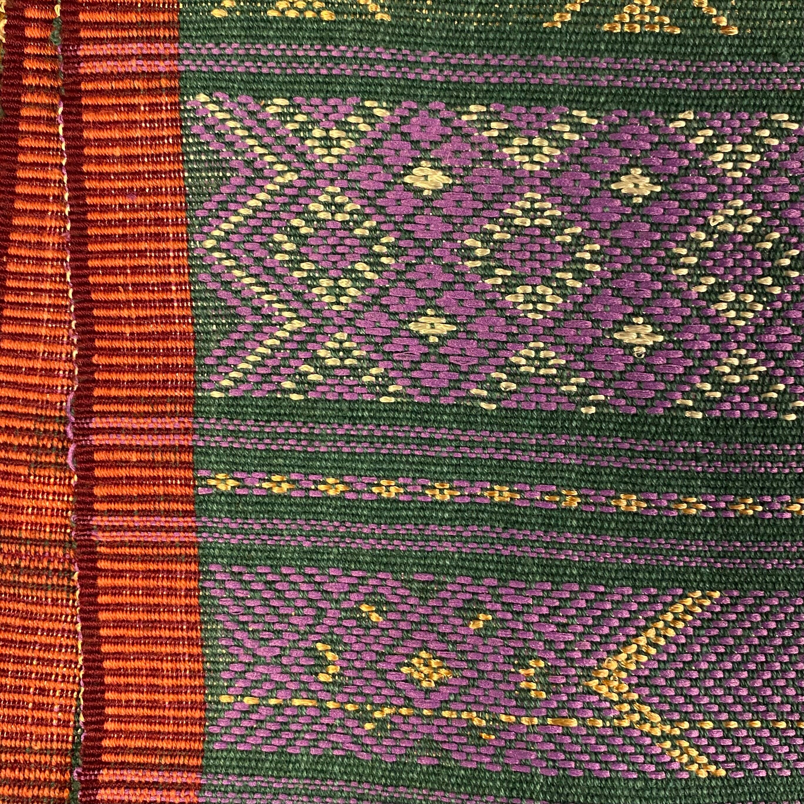 ミャンマー西北部、ラカイン州のミンビャーから、さらに奥地へボートで入った場所で暮らすソントゥ族(一部レイトゥ族)の方たちが織った織物で、腰機(こしばた)で織られています。