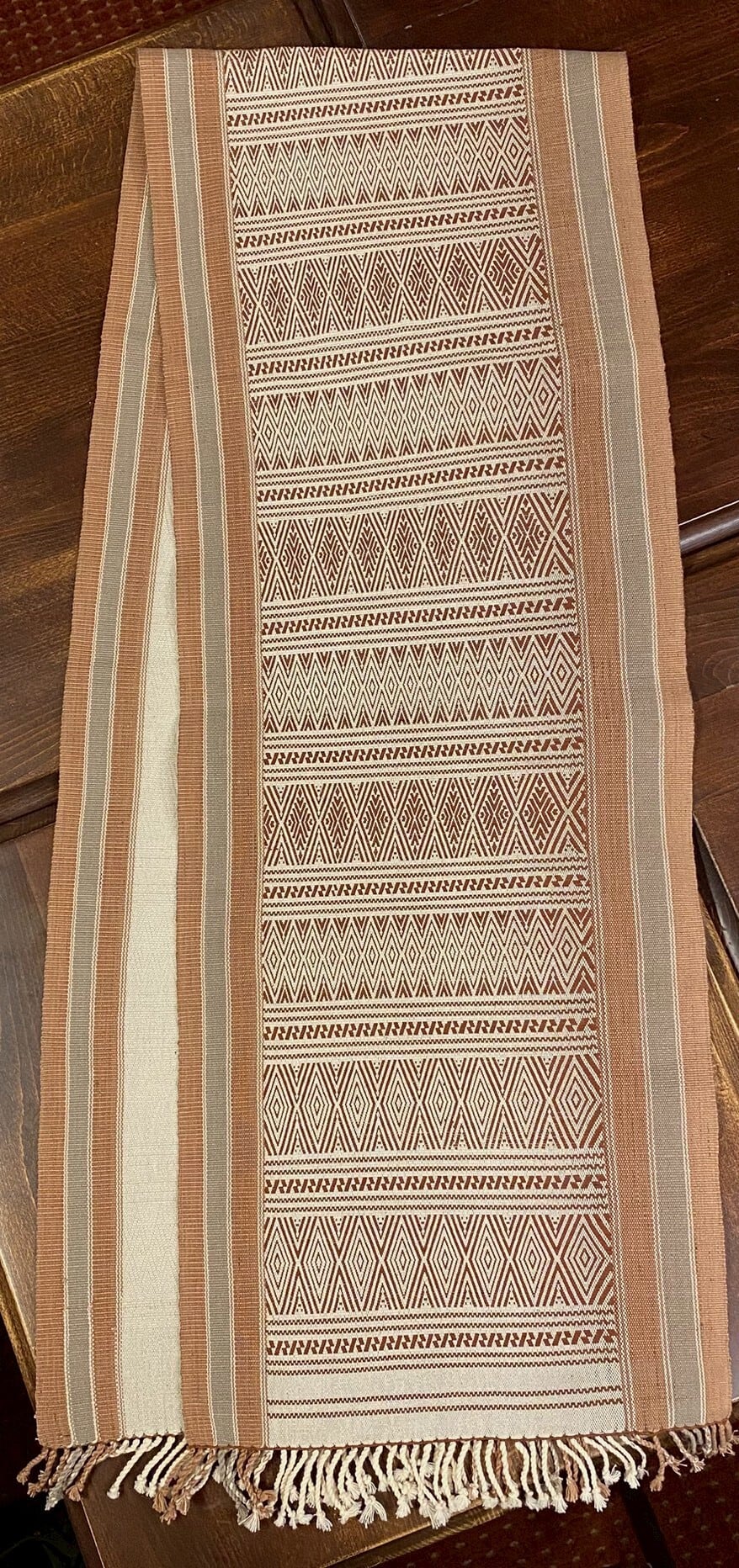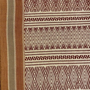 ミャンマー北西部ラカイン州のミャーウーで腰機で手織りされたカミイ族の布。(カミイ族はチン族の一部族です)茶色は木の幹、グレーはミロバランという植物の実から染められた草木染めです。