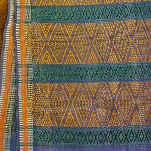 ミャンマー西北部、ラカイン州のミンビャーから、さらに奥地へボートで入った場所で暮らすソントゥ族(一部レイトゥ族)の方たちが織った織物で、腰機(こしばた)で織られています。(ソントゥ族はチン族の一部族です)